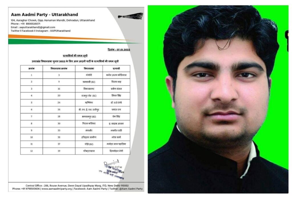 रुड़की। उत्तराखंड में 2022 विधानसभा चुनाव की आम आदमी पार्टी ने अपने प्रत्याशियों की पहली लिस्ट जारी कर दी है। आम आदमी पार्टी ने पहली लिस्ट में 24 विधानसभा प्रत्याशियों को नाम का एलान किया दिया है।कर्नल अजय कोठियाल गंगेत्री, इंजीनियर शादाब आलम विधानसभा पिरान कलियर का प्रत्याशी बनाया है। आप प्रत्याशी इंजीनियर शादाब आलम ने दिल्ली के मुख्यमंत्री अरविंद केजरीवाल,कर्नल अजय कोठियाल और आम आदमी पार्टी की पूरी टीम का प्रत्याशी बनाने पर धन्यवाद कहा है। शादाब आलम ने कहा कि आम आदमी पार्टी ने मुझ पर जो विश्वास की हैं उस पर पूरा खरा उतरने का पूरा प्रयास करूंगा। शादाब आलम की प्रत्याशी बनाने की खबर सुनते हैं आप कार्यकर्ताओ में खुशी की लहर दौड़ गई सभी ने कार्यकर्ताओं ने एक दूसरे को मिठाई खिलाकर खुशी का इजहार किया।