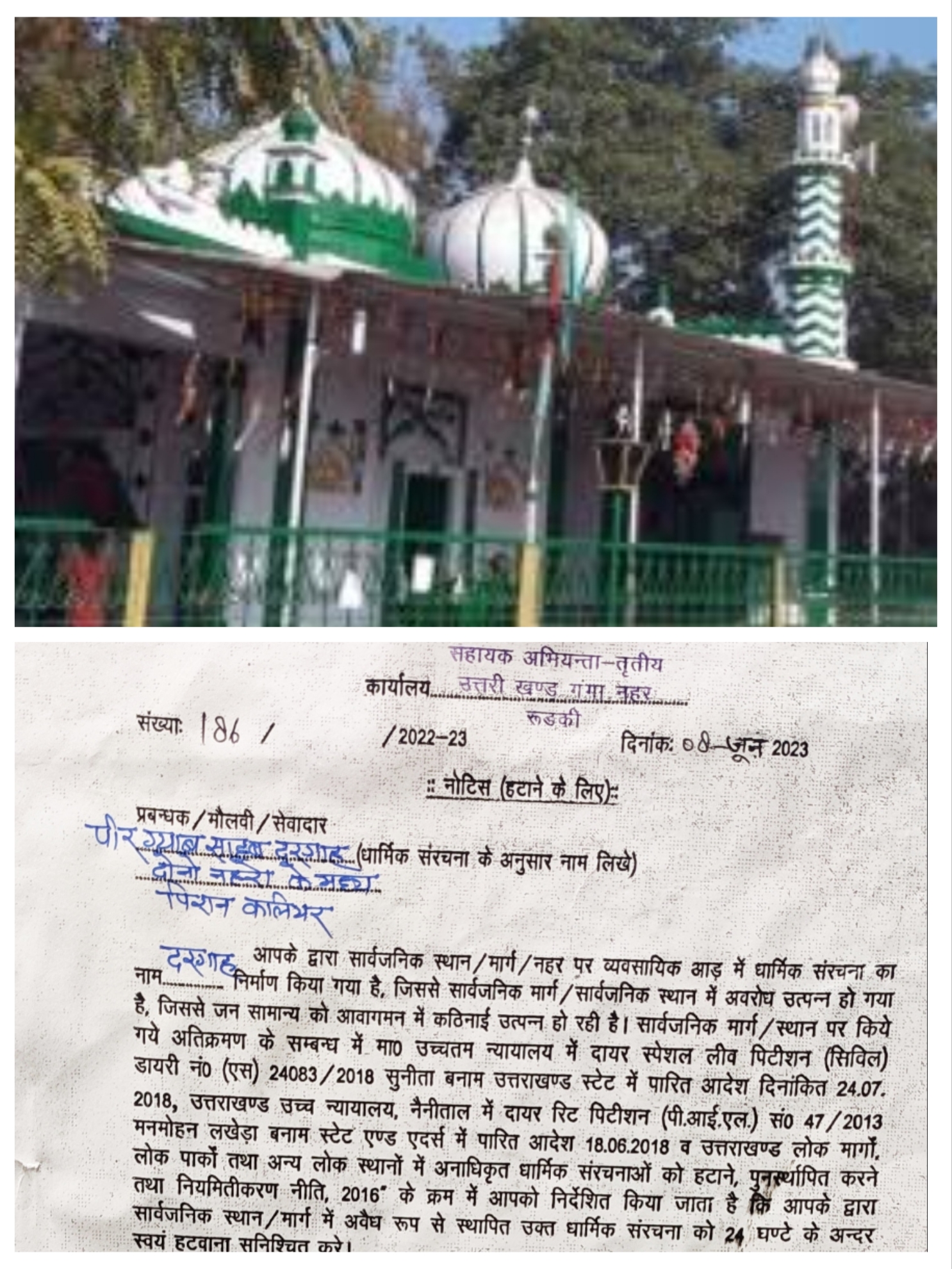 कलियर।शुकरवार को ब्रिटिश काल से पहली बताई जा रही दरगाह पीरगैब अली शाह को सहायक अभियन्ता तृतिय उत्तरी खण्ड गंगा नहर रुड़की द्वारा 24 घण्टे में दरगाह को हटाने का नोटिस चस्पा किया गया है। जिस्से क्षेत्र के लोगो में रोष पनप रहा है।वही क्षेत्र के लोगो का कहना है की हरिद्वार से लेकर यूपी बॉर्डर तक नहर किनारे कई दर्जन अवैध पक्के निर्माण व धार्मिक स्थल बना कर सरकारी जमीन पर कब्जा कर्रख्खा है।