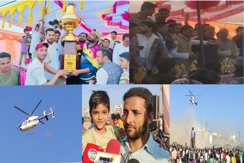 तालकटोरा स्टेडियम पर खेले जा रहे टूर्नामेंट में विधायक उमेश कुमार ने हेलीकॉप्टर से फूल बरसाए,कलियर की टीम ने मुकरपुर को 100 रन से हराकर ट्राफी अपने नाम की।