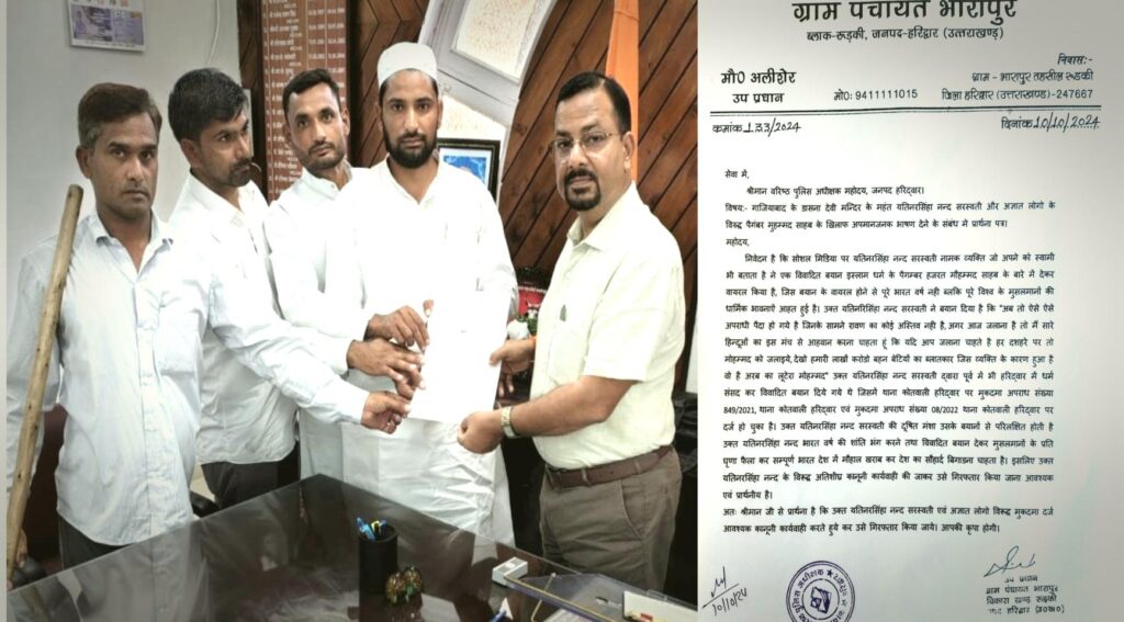 हरीद्वार।गुरूवार को ग्राम भारापुर के उप प्रधान अलीशेर ने अपने साथियो के साथ ज़िलाधिकारी हरिद्वार कर्मेन्द्र सिंह से मुलाक़ात कर उनको महामहिम राष्ट्रपति श्रीमती द्रौपदी मुर्मू और प्रधानमंत्री श्री नरेन्द्र मोदी के नाम एक ज्ञापन दिया।वही क्षेत्र के लोगो ने कहा कि देश में सभी धर्मो के व्यक्ति अमन शांति भाईचारे के साथ रहते है। लेकिन कुछ लोगो को देश मैं भाई चारा पसंद नहीं है जिससे मुस्लिम समुदाय की धार्मिक भावनाओ को आहात करने के उद्धेस्य से मुस्लिमो की आस्थाओ के प्रति हमारे नबी मो० साहब की शान में अपमानजनक एवं अमर्यादित भाषा का प्रयोग किया।ज्ञापन में पैगंबर मोहम्मद साहब (स० अ० व०) पर यतिनरसिंहानंद सरस्वती के द्वारा अपमानजनक टिप्पणी को लेकर कार्रवाई कि मांग की।और उप प्रधान अलीशेर ने आग्रह किया कि ऐसे मामलों को लेकर देश में कड़े और सख़्त क़ानून बनाए जाएं।वही उन्होने कहा कि यतिनरसिंहानंद सरस्वती और उसके शिष्यों के खिलाफ राष्ट्रीय सुरक्षा कानून (NSA) के तहत कानूनी कार्यवाही कीजाए।वही एसएसपी हरिद्वार को भी एक शिकायती पत्र देकर यतिनरसिंहानंद सरस्वती के ख़िलाफ़ मुक़दमा दर्ज कर कठोर कानूनी कार्यवाही करने और इसको मिली हुई ज़मानत को खारिज करके दोबारा जेल में डालने की मांग की।इस मौके पर अलीशेर,राशिद,समद,तबरेज आदि शामिल रहे।