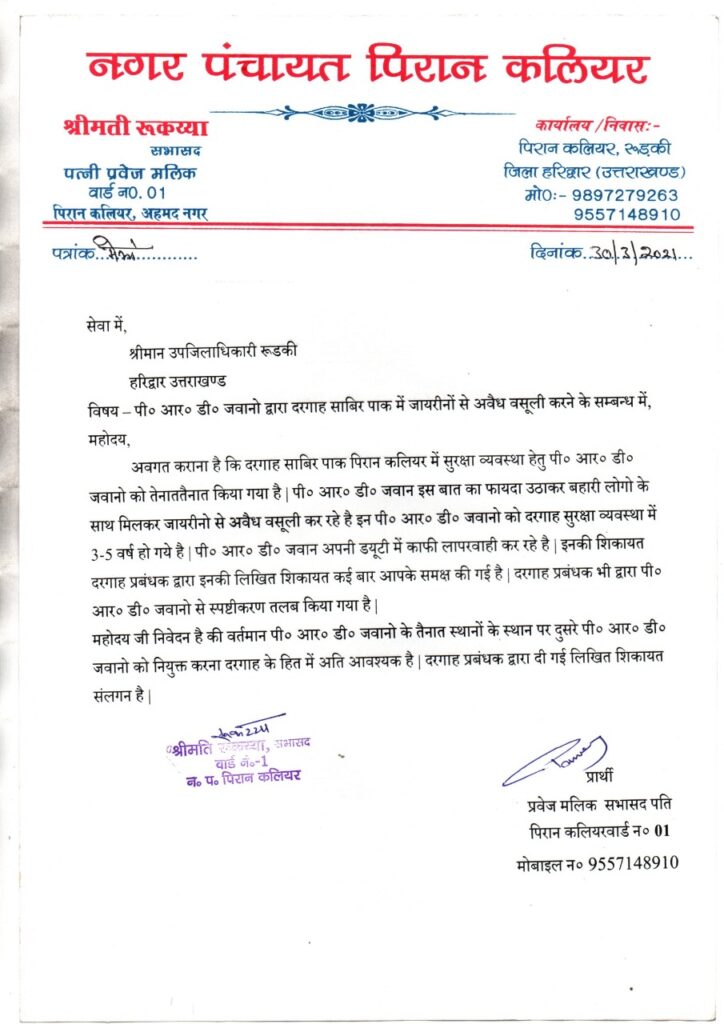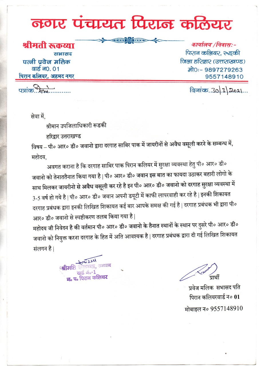 पिरान कलियर सभासद पती प्रवेज मलिक ने उप जिलाधिकारी रूड़की को शिकायती पत्र लिखकर पीआरडी जवानों को बदलने कि मांग की।