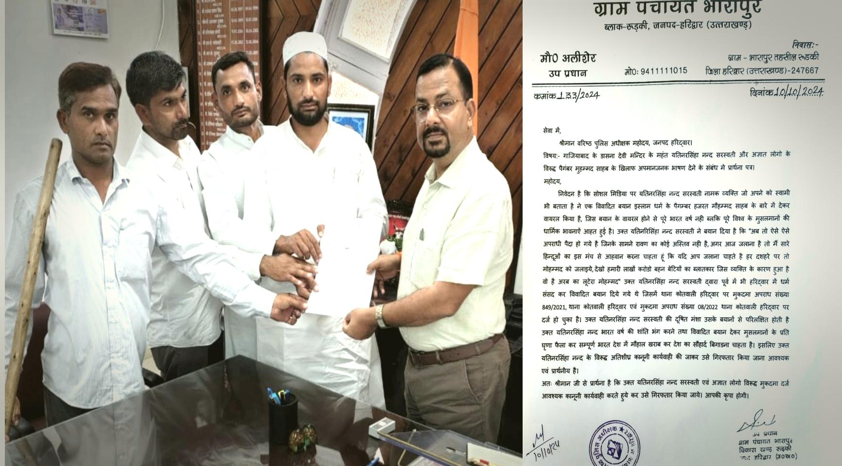 869 total views गुरूवार को उप प्रधान अलीशेर ने ज़िलाधिकारी कर्मेन्द्र सिंह व एसएसपी को यतिनरसिंहानंद के खिलाफ एक ज्ञापन दिया। ब्यूरो रिपोर्ट: 24 पब्लिक न्यूज़। हरीद्वार।गुरूवार को ग्राम भारापुर के उप प्रधान अलीशेर ने अपने साथियो के साथ ज़िलाधिकारी हरिद्वार कर्मेन्द्र सिंह से मुलाक़ात कर उनको महामहिम राष्ट्रपति श्रीमती द्रौपदी […]