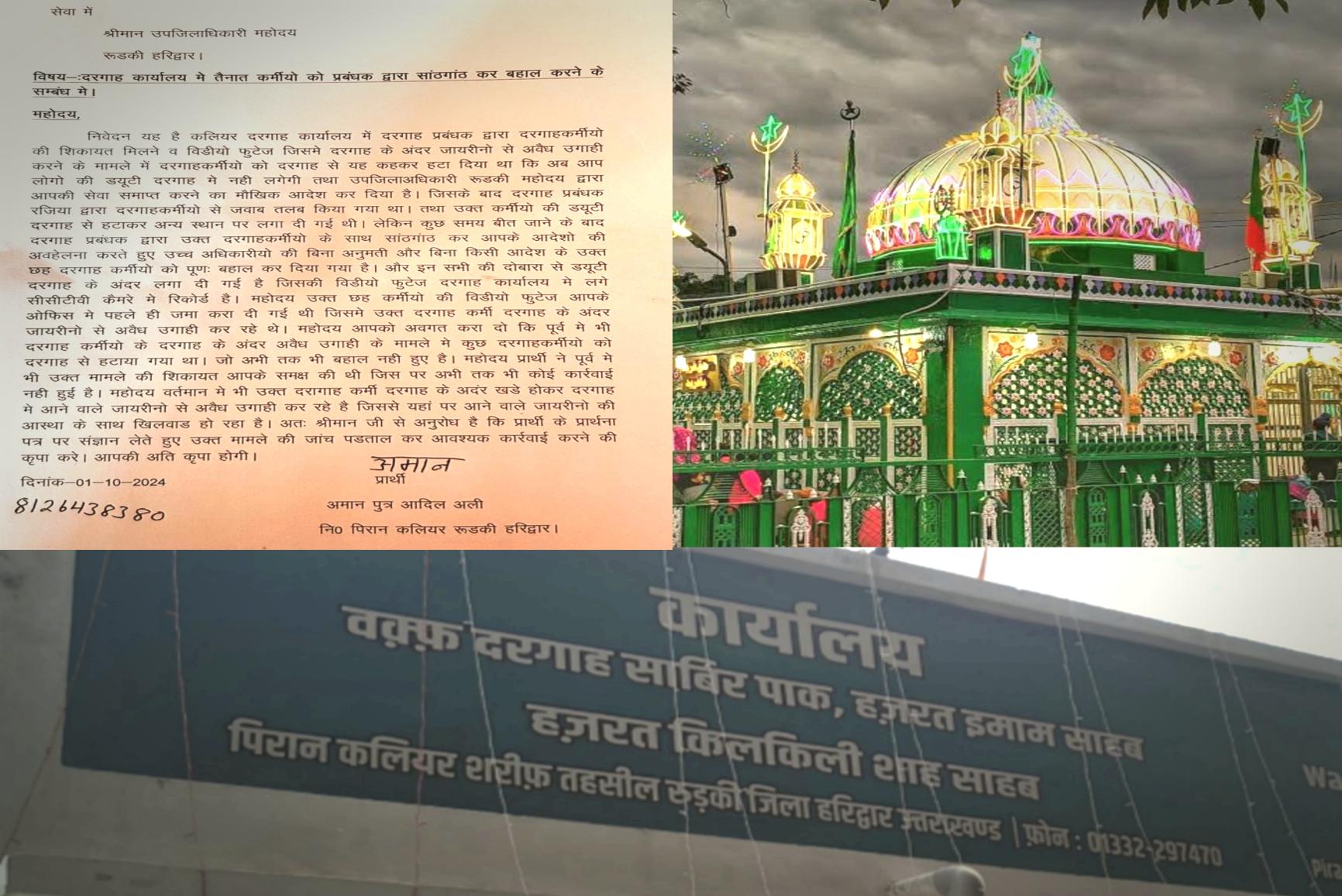 1,393 total views कलियर निवासी युवक ने उपजिलाधिकारी को पत्र देकर बताया,पूर्व में हटाए गए दरगाह कर्मचारियों के साथ साठ गाठ कर पूर्ण बहाल करने के संबंध में। ब्यूरो रिपोर्ट: 24 पब्लिक न्यूज़ रुड़की।मंगलवार को कलियर निवासी अमान ने उपजिलाधिकारी को शिकायत पत्र देकर बताया की कलियर दरगाह कार्यालय में दरगाह […]